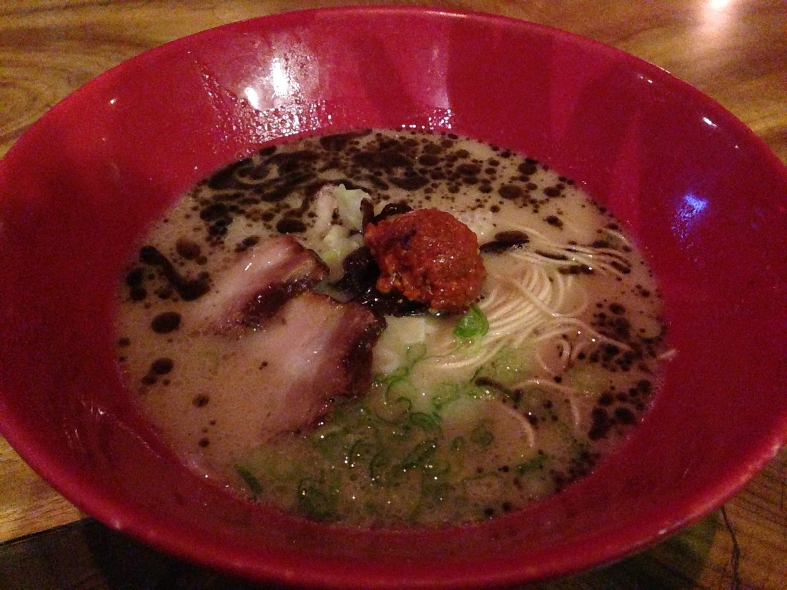 中央に浮いている赤いのは辛みそ。これをスープに溶かすことによってピリ辛でより複雑な味わいになります。